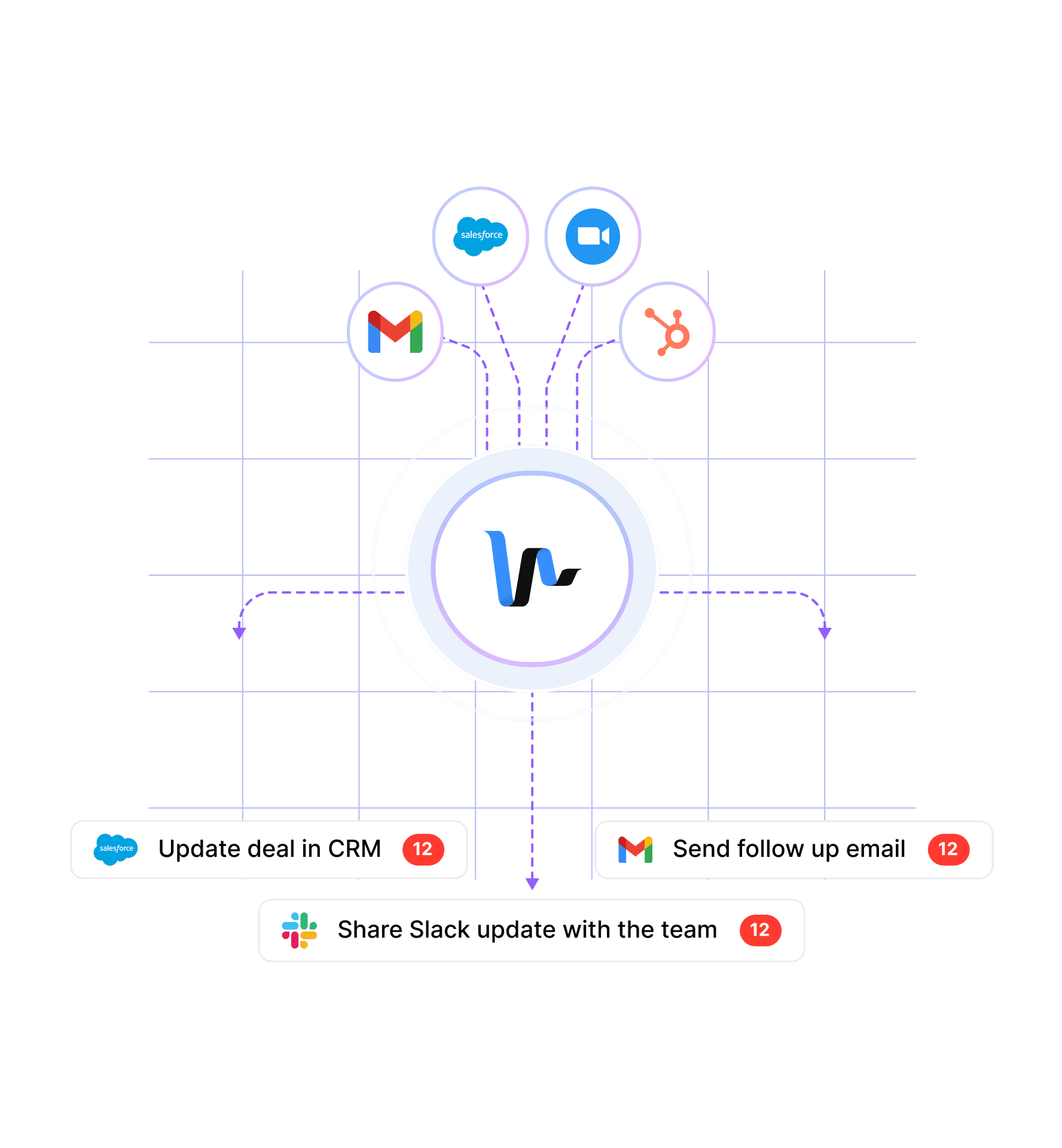 Works with your stack: Salesforce, HubSpot, Slack, Teams.